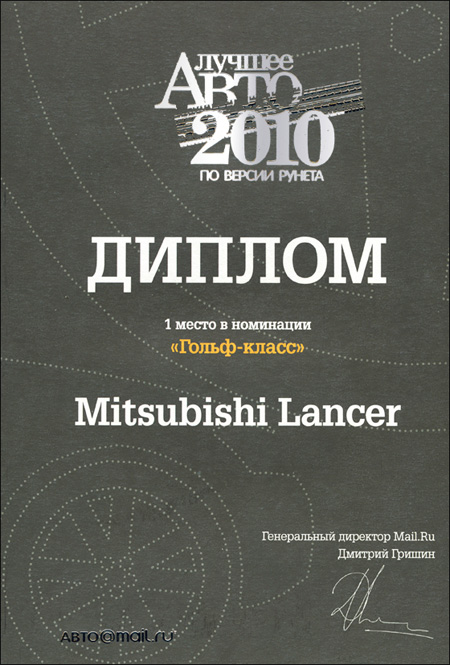 По результатам конкурса Mitsubishi Lancer Х победил в номинации «Гольф класс» - за автомобиль было отдано 96 391 голосов. Всего в голосовании по каждой номинации приняли участие более 600 тысяч интернет-пользователей. Отметим, особенно приятно, что эта награда присуждается Mitsubishi Lancer X уже в третий раз - десятое поколение Лансера продолжает славную традицию бренда, отмеченного многими престижными призами.
