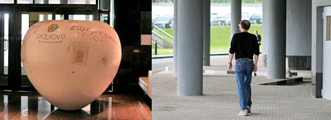 На первом этаже в холле стоит огромное яблоко, испещрённое легкомысленными рисунками и чьими-то автографами. «Яблоко знаний» является символом Сколково, потому что оно падало на голову Ньютона. Компания Apple как бы ни при чём. Впрочем, встретить Стива Джобса тут можно запросто.