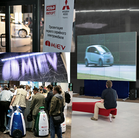 Виновника торжества на премьере чествовали донельзя инновационно. Фирменный знак Аймиева бросался в глаза с брюха роботов и ниспадал струями на водяном экране. Тем временем сам электромобиль ломал зрителям глаза с «переливных» постеров и сломя голову носился по гигантской видеостене. Перед экраном стояли сколковские красные диванчики, которые по невероятному совпадению выглядят как трилистник Mitsubishi.